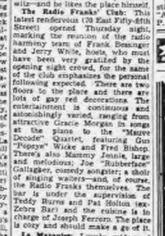 These same texts confirm that Wicke and the legendary "Wickie" are one and the same. On February 5, 1938, The New York Post described the opening of the Radio Franks Club, "marking the reunion of the radio harmony team of Frank Bessinger and Jerry White, hosts... [performers include] the 'Mauve Decade' Quartet, featuring Gus 'Popeye' Wicke and Fred Bishop."
