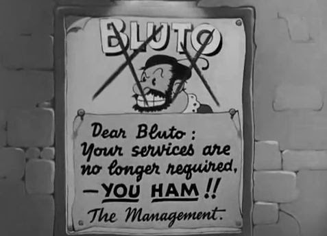 Legend: In 1938, infamous Popeye nemesis Bluto lost his voice—literally!—due to the death of Fleischer voice artist Gus Wickie. We're not sure how Wickie died... but as of 1938, he was gone, gone, gone. Blow me down!
