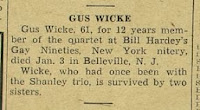 Mid-1930s texts again reference Wicke's role in a quartet. Billboard 7/22/36: "...Jerry White, Gus Wicke, Fred Bishop and Paul Davin, the Gay Nineties quartet, have been renewed at that New York night spot by Bill Hardy..."
